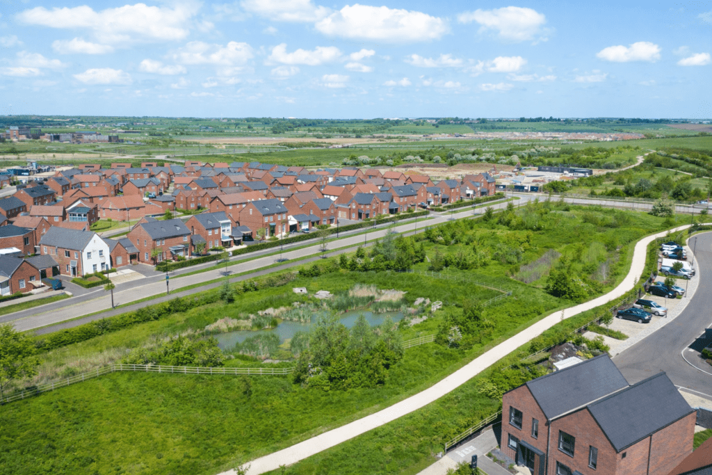 - Commercial and industrial sites – perimeter corridors that connect retained habitat with new planting and SuDS features